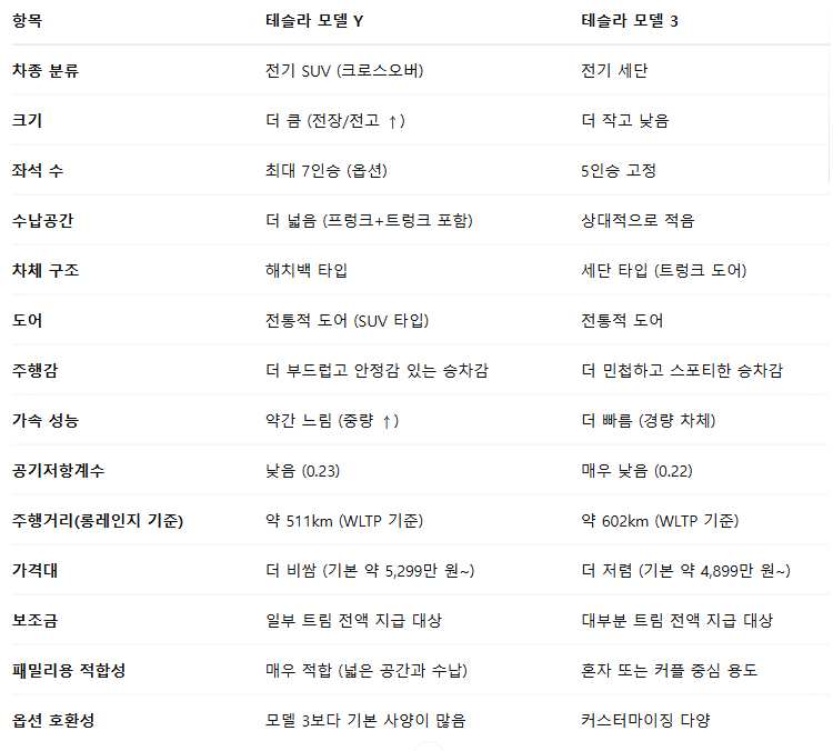보조금과 가성비가 중요하다면 모델 3를, 공간과 활용성이 중요하다면 모델 Y를 고려해보세요.