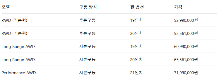 - 예: 모델 Y RWD (19인치 기준 5,299만 원)