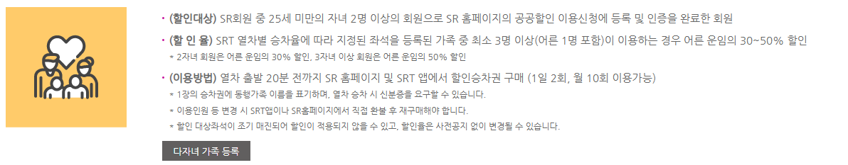 추가할인은 정부24홈페이지에서 등록하거나, SR홈페이지, 오프라인에서 가능합니다. 또한 추가 할인은 공공 할인과 중복 적용이 가능하므로, 해당되는 모든 할인을 등록하여 최대 혜택을 받으시기 바랍니다.