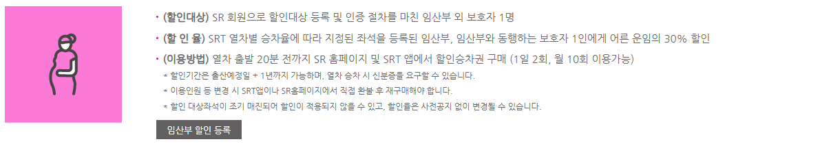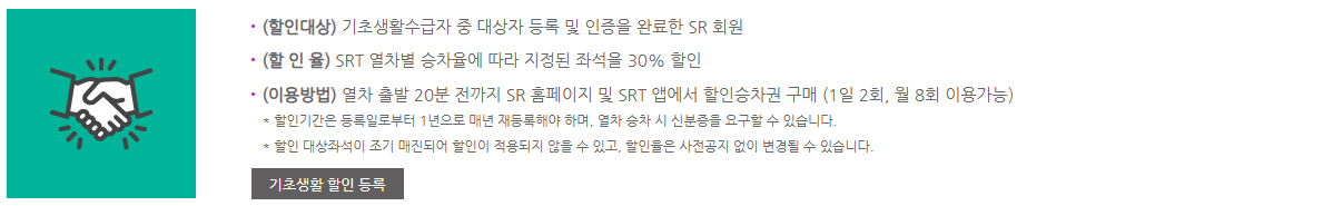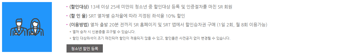 - 공공 할인은 SRT 홈페이지 또는 앱을 통해 할인 대상 등록 및 인증 절차를 완료해야 적용됩니다.